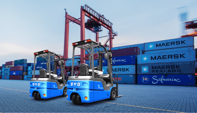 例如英國的一家大型跨境物流解決方案提供商,與比亞迪叉車合作的車型包括平衡重式叉車、前移式叉車等產品,主要用于倉庫的集裝箱裝卸、倉內搬運以及上下貨架等作業。客戶認為比亞迪叉車轉向流暢、動力強勁,且擁有創新的鋰電池技術,充電快、能耗低,大大降低了設備的維修、保養等成本。客戶對使用效果很滿意,現在已經把倉庫內上百臺其它品牌的叉車全部更換為比亞迪叉車。