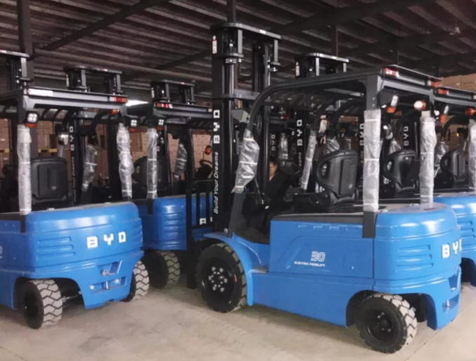 **,比亞迪叉車為濰坊基地提供近百臺平衡重式叉車;